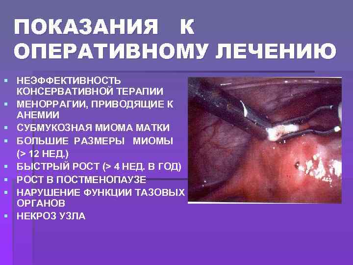 ПОКАЗАНИЯ К ОПЕРАТИВНОМУ ЛЕЧЕНИЮ § НЕЭФФЕКТИВНОСТЬ КОНСЕРВАТИВНОЙ ТЕРАПИИ § МЕНОРРАГИИ, ПРИВОДЯЩИЕ К АНЕМИИ § СУБМУКОЗНАЯ МИОМА МАТКИ § БОЛЬШИЕ РАЗМЕРЫ МИОМЫ (> 12 НЕД. ) § БЫСТРЫЙ РОСТ (> 4 НЕД. В ГОД) § РОСТ В ПОСТМЕНОПАУЗЕ § НАРУШЕНИЕ ФУНКЦИИ ТАЗОВЫХ ОРГАНОВ § НЕКРОЗ УЗЛА