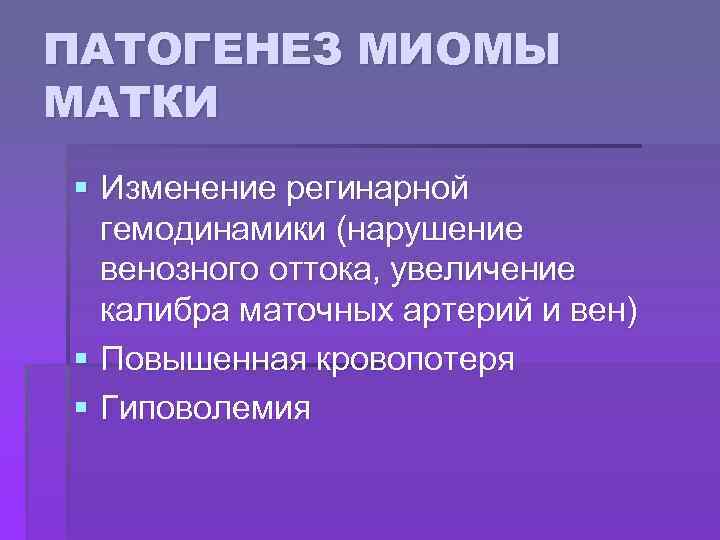 ПАТОГЕНЕЗ МИОМЫ МАТКИ § Изменение регинарной гемодинамики (нарушение венозного оттока, увеличение калибра маточных артерий и вен) § Повышенная кровопотеря § Гиповолемия