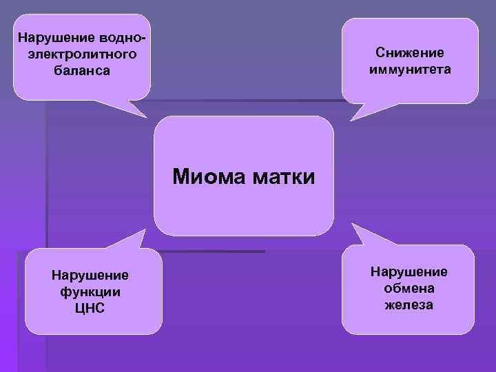 Нарушение водноэлектролитного баланса Снижение иммунитета Миома матки Нарушение функции ЦНС Нарушение обмена железа