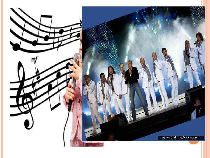 ВОКАЛЬНЫЕ ПЕСНЯ Песня — наиболее простая, но распространенная форма вокальной музыки, объединяющая поэтический текст с несложной, легко запоминающейся мелодией. Иногда сопровождается оркестром (также мими кой). Песня в широком значении включает в себя всё, что поётся, при условии одновременного сочетания слова и напева; в узком значении — малый стихотворный лирический жанр, существующий у всех народов и характеризующийся простотой музыкально-словесного построения[. Песни отличаются по жанрам, складу, формам исполнения и другим признакам. Песня может исполняться как одним певцом так и хором. Песни поют как с инструментальным сопровождением, так и без него (a cappella).
