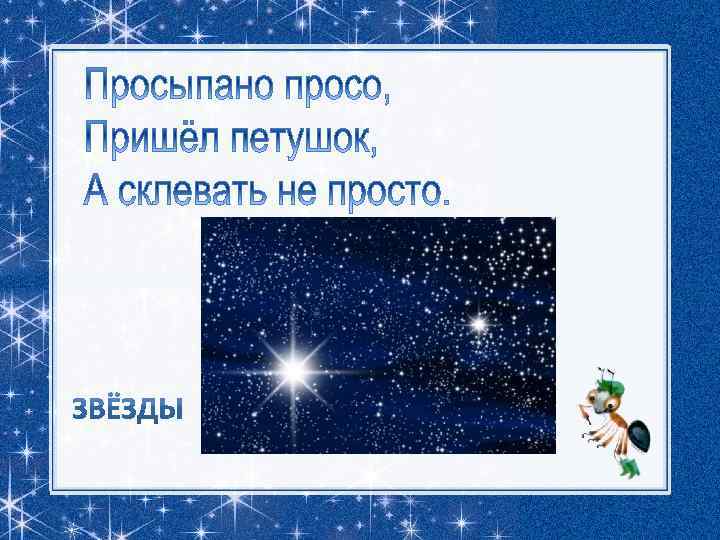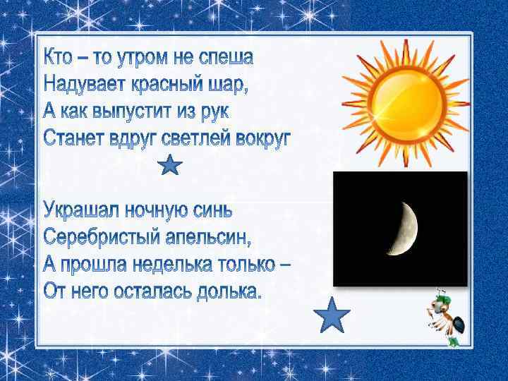 Звёздное небо яркое и красивое, таинственное и сказочное. В ясный безоблачный вечер оно над вашей головой усыпано множеством звёзд. Они кажутся маленькими сверкающими точками, потому что находятся очень далеко от Земли. На самом деле звёзды – это огромные раскалённые газовые шары, похожие на Солнце.