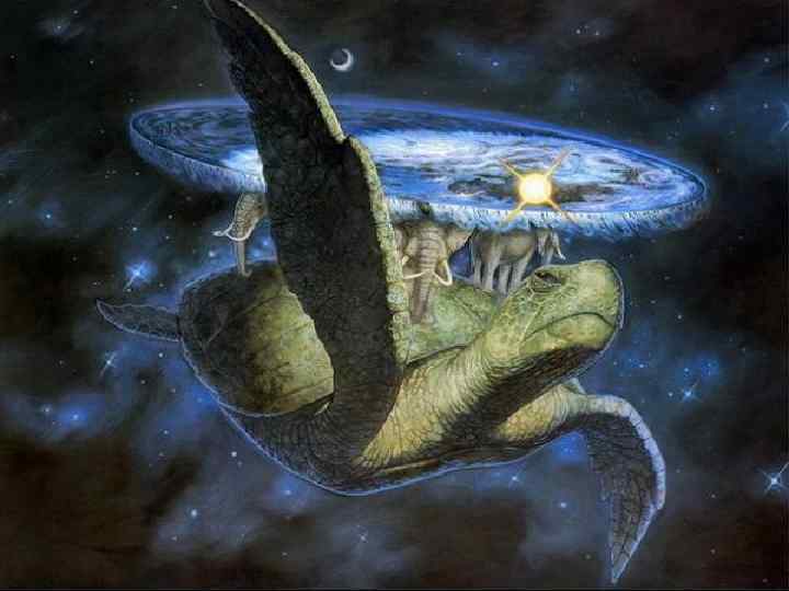 Сегодня известно, что Земля имеет форму шара. Но когда-то люди считали подругому. В одних странах люди представляли себе Землю в форме половинки яблока, которая плоской частью лежит на трёх китах, плавающих в океане. В других странах представляли, что Земля лежит на трёх слонах, а слоны стояли на черепахе, которая плавает в океане.