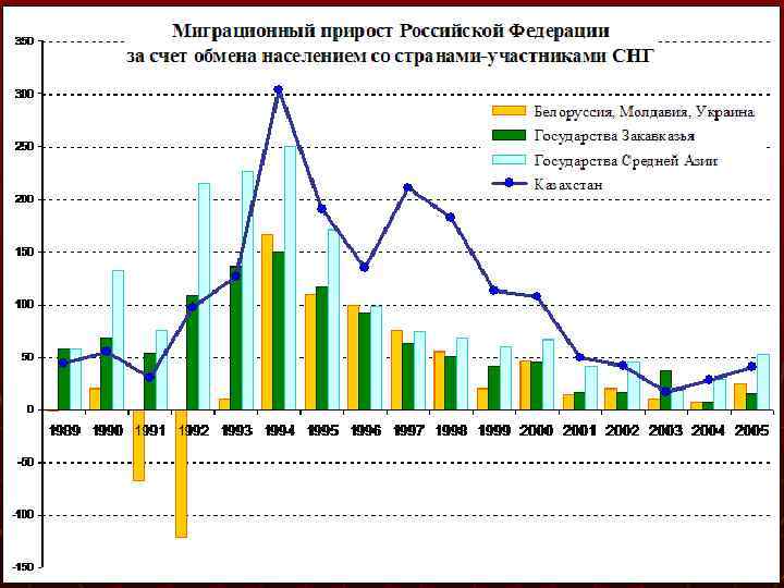 Международная миграция населения, в чел. , 19902012 гг. Заметно снижение оттока населения к концу 1990 -ых г. В 2000 -ые годы уменьшается отток квалифицированной рабочей силы, но наблюдается прирост трудовых иммигрантов из ряда республик СНГ. Совпадение динамики миграционных притоков населения из республик СНГ (Украина, Молдавия, Армения, Азербайджан, республики Средней Азии) свидетельствует об их трудовом качестве. Исключение составляют мигранты из Казахстана, которые, скорее всего, являются русским населением или ассимилированными казахами, переехавшими в Россию не на трудовые заработки, а на ПМЖ. В 2012 г. 91% всего миграционного прироста приходился на страны СНГ, из них 50 % - это представители республик, исповедующих ислам (Азербайджан, Таджикистан, Туркменистан, Киргизия, Узбекистан), вместе с Казахстаном - 63, 5%. Приток с одной стороны низкоквалифицированной рабочей силы, с другой стороны увеличение представителей других религиозных конфессий поднимает вопрос об иммиграционном вызове национальной идентичности.
