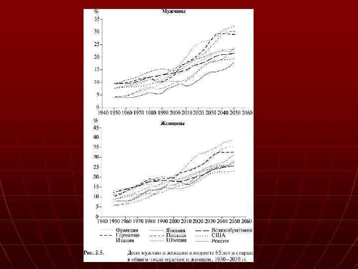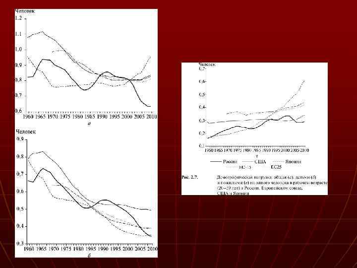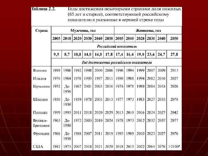 Поло-возрастные особенности РФ n n n Трудоспособное население (м. 16 -59 лет, ж. 16 -54 лет) - 89, 0 млн. (61%), моложе трудоспособного возраста - 26, 3 млн. человек (или 18%) Старше трудоспособного возраста - 29, 8 млн. человек (или 21%) n n n старение населения 1989 -2002 гг. –средний возраст увеличился на 3 года (37, 7 лет; мужчин - 35, 2 лет, женщин - 40, 0 лет) данные переписи 1989 г. – средний возраст - 34, 7 лет, мужчин - 31, 9 лет, женщин - 37, 2 лет).