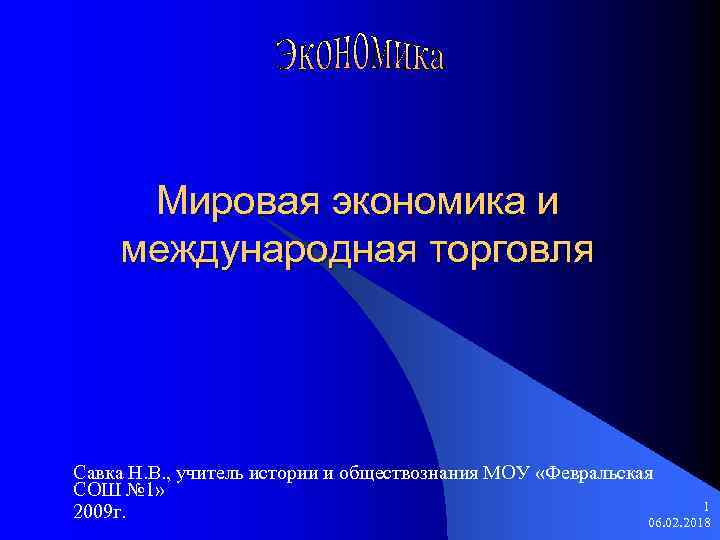 Мировая экономика и международная торговля Савка Н. В. , учитель истории и обществознания МОУ «Февральская СОШ № 1» 1 2009 г. 06. 02. 2018