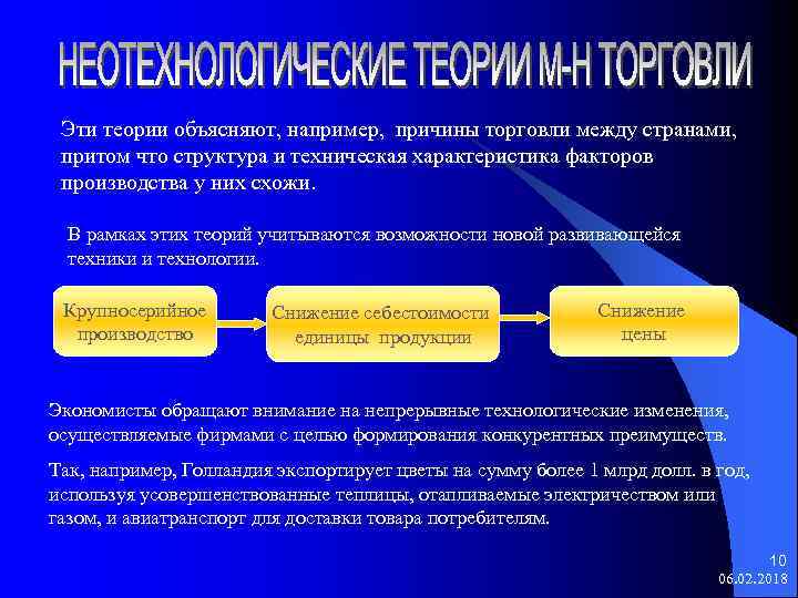 Эти теории объясняют, например, причины торговли между странами, притом что структура и техническая характеристика факторов производства у них схожи. В рамках этих теорий учитываются возможности новой развивающейся техники и технологии. Крупносерийное производство Снижение себестоимости единицы продукции Снижение цены Экономисты обращают внимание на непрерывные технологические изменения, осуществляемые фирмами с целью формирования конкурентных преимуществ. Так, например, Голландия экспортирует цветы на сумму более 1 млрд долл. в год, используя усовершенствованные теплицы, отапливаемые электричеством или газом, и авиатранспорт для доставки товара потребителям. 10 06. 02. 2018