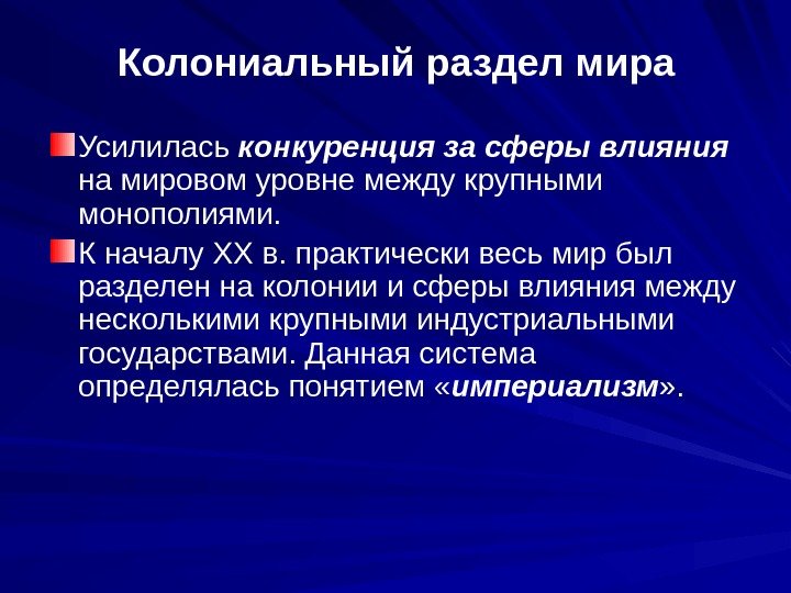 Колониальный раздел мира Усилилась конкуренция за сферы влияния на мировом уровне между крупными монополиями. К началу ХХ в. практически весь мир был разделен на колонии и сферы влияния между несколькими крупными индустриальными государствами. Данная система определялась понятием « империализм » .