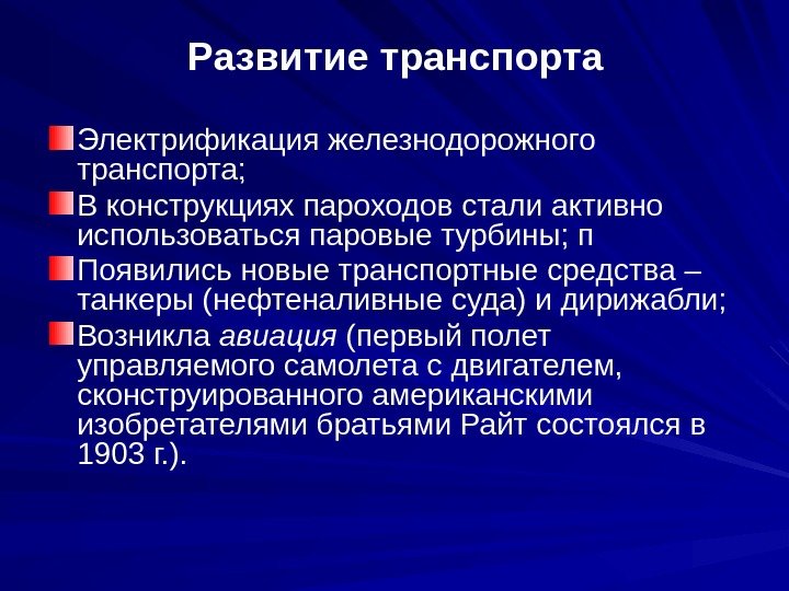 Развитие транспорта Электрификация железнодорожного транспорта; В конструкциях пароходов стали активно использоваться паровые турбины; п Появились новые транспортные средства – танкеры (нефтеналивные суда) и дирижабли; Возникла авиация (первый полет управляемого самолета с двигателем, сконструированного американскими изобретателями братьями Райт состоялся в 1903 г. ).