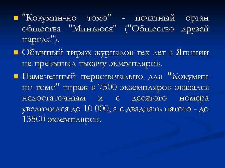 "Кокумин-но томо" - печатный орган общества "Минъюся" ("Общество друзей народа"). n Обычный тираж журналов тех лет в Японии не превышал тысячу экземпляров. n Намеченный первоначально для "Кокуминно томо" тираж в 7500 экземпляров оказался недостаточным и с десятого номера увеличился до 10 000, а с двадцать пятого - до 13500 экземпляров. n