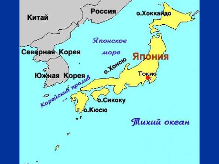 Япония - Страна восходящего солнца. n Нихон или Ниппон. Слово, введенное в оборот в 645 году, состоит из двух иероглифов - "нити" (солнце) и "хон" или "пон" (корень, основание). n 4 тысячи островов в западной части Тихого океана. n Крупнейшие из них - Хонсю (Хондо), Хоккайдо, Кюсю и Сикоку в настоящее время соединены мостами и тоннелями. n 372 тыс. кв. км. n