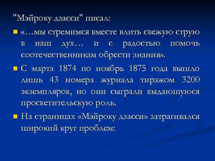 В редакционной статье первого номера "О целях издания "Дзидзи симпо" Фукудзава, подводя итоги 25 -летнему существованию школы Кэйто, написал: "Я стремлюсь только к одному - расширению прав государства". n Рупором просветительских идей, связанных с умением учиться у Запада, был журнал "Мейроку дзаси". n Стал выходить в 1874 году, издавался просветител-ой орган-ей "Мейрокуся". n