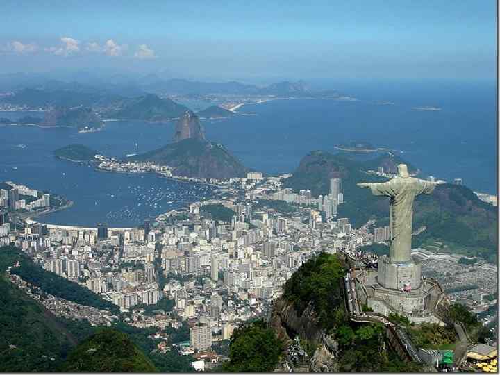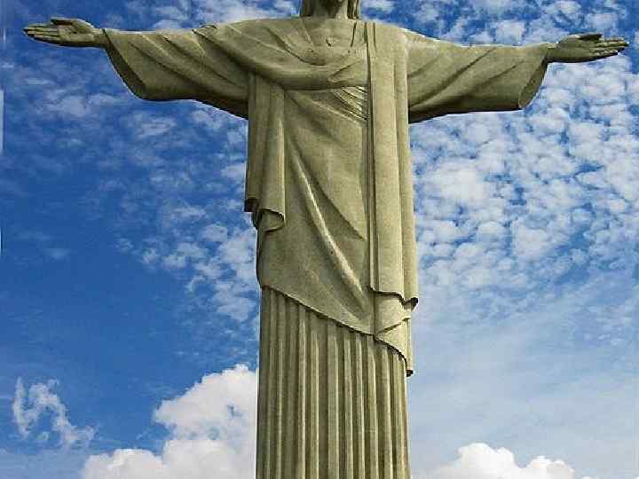 Статуя Христа Искупителя Знаменитая Статуя Христа Искупителя на вершине Корковадо в Рио-де -Жанейро. Считается символом Рио-де-Жанейро и Бразилии в целом. Ежегодно миллионы туристов поднимаются к подножию статуи, откуда открывается ошеломляющая панорама города и бухты с живописной горой Сахарная Голова, знаменитыми пляжами Копакабана и Ипанема, огромной чашей стадиона «Маракана» . На вершину ведет электрифицированная железная дорога (первая в Бразилии), с курсирующим по ней миниатюрным поездом. Она была построена инженерами Перейрой Пассосом и Терсейрой Соарешем задолго до статуи Христа — в 1882— 1884 гг. , и впоследствии сыграла большую роль в сооружении монумента: по ней наверх доставлялись строительные материалы. Добраться до статуи можно также на машине по автостраде, проходящей через государственный заповедник Тижука является крупнейшим лесным массивом в мире, находящимся в городской черте. Точные размеры статуи Христа Искупителя составляют: высота — 38 метров, в том числе пьедестала — 8 м; вес — 1145 тонн; размах рук — 30 метров.