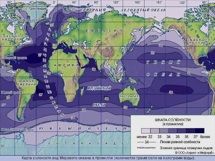 Свойства вод Мирового океана 1. Соленость воды. Вода — прекрасный растворитель. Поэтому в природе нет воды, не содержащей растворимых веществ. Такую воду (дистиллированную) можно получить только в лаборатории. Количество граммов веществ, растворенных в 1 л (килограмме) воды, называют соленостью. Средняя соленость воды Мирового океана 35 промилле (то есть в каждом килограмме воды содержится 35 г соли). Если всю морскую соль в сухом виде распределить по поверхности суши, то ее слой составит почти 150 м.