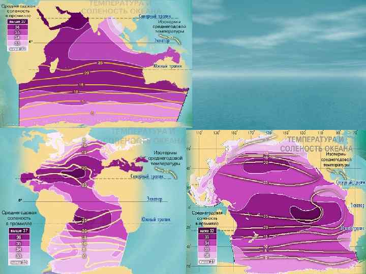 Какие причины влияют на величину солености? Экваториальные широты — 34‰ Тропические широты — 35, 8‰ В том числе: в Тихом океане — 36, 5 ‰ в Индийском океане — 36, 5 ‰ в Атлантическом — 37, 5 ‰ Умеренные широты — 33 ‰