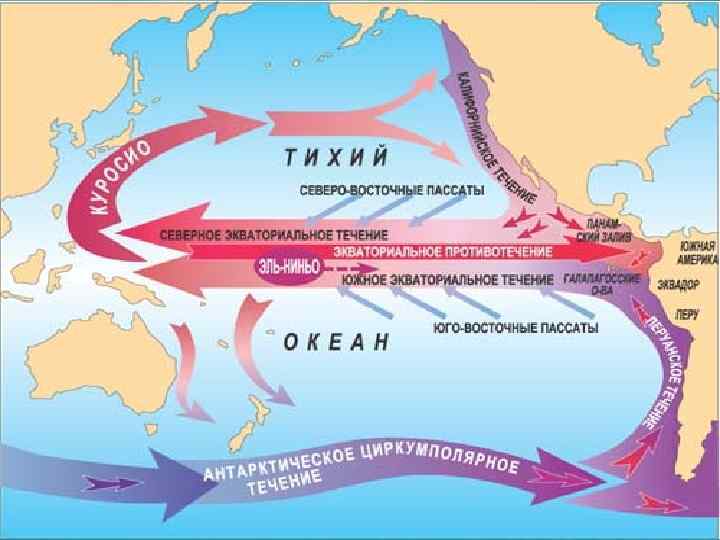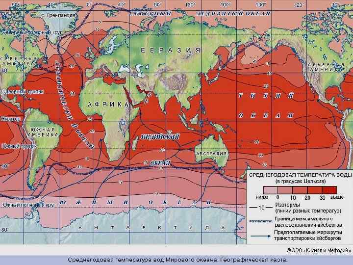 Температура вод Мирового океана Самая высокая температура у поверхности воды в Тихом океане — 19, 4 °С; Индийский океан имеет 17, 3 °С; Атлантический — 16, 5 °С. При таких средних температурах вода в Персидском заливе регулярно нагревается до 35 °С. С глубиной температура воды, как правило, падает. Хотя бывают исключения, обусловленные поднятием глубинных теплых вод. Примером может служить западная часть Ледовитого океана, куда вторгается Гольфстрим. На глубине 2 км на всей акватории Мирового океана обычно температура не превышает 2 -3 °С; в Северном Ледовитом океане она еще ниже.