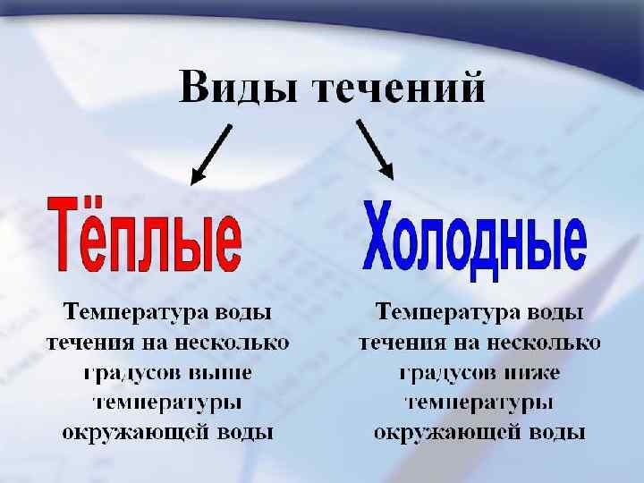 Типы водных масс Типы водных Температу- Соленость Прозрачмасс ра ность Экваториальные высокая низкая высокая Тропические высокая Умеренные меняется по сезонам низкая Арктические низкая средняя