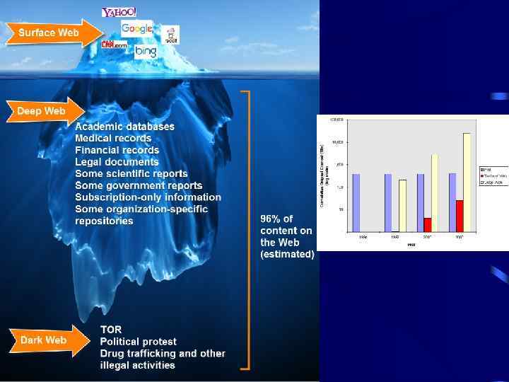 Проблемы использования ИПС Объем и доступность информации • БД ИПС растет как логарифмическая функция – количество веб-страниц возрастает как степенная функция • Не все ресурсы доступны (правила индексации, установленный запрет на индексирование, динамические вебсайты, мультимедийное наполнение и пр. ) • Общий объем лежащих на поверхности ресурсов (surface web) – около 19 Тбайт • Недоступный, невидимый объем (deep web, invisible web) – около 7500 Тбайт соотношение 1: 400 • По данным компании Bright. Planet 2000 г. – невидимый объем в 500 раз больше