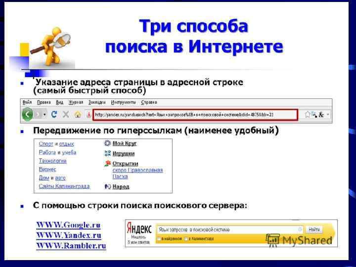 Специализированные базы данных и поисковые инструменты Site-specific search engines Тематически специализированные объемные БД на WWW, поиск по которым не поддерживается автоматическими индексами • Базы имен и адресов, библиографические базы данных, цитаты, газетные статьи, словари энциклопедии, информация для трудоустройства и подбора кадров • Географические карты, информация в области культуры, прогноза погоды, тексты песен, видео продукция, здоровье, бизнес-партнеры Infomine (БД по различным видам искусства); Information. Please (полнотекстовая энциклопедическая информация); Университетская информационная система "Россия" (официальные документы в области экономики, социологии, политологии, международных отношений, Wayback Machine (архив веб-сайтов, начиная с 1996 года); ИНТЕГРУМ-ТЕХНО (открытые источники информации СМИ, аналитические исследования и обзоры, адресносправочные и правовые базы данных, информация РОСПАТЕНТа, ГОСКОМСТАТа); ИНИОН – Институт научной информации по общественным наукам РАН (аннотированные описания книг и статей из журналов и сборников на 140 языках мира библиотеки ИНИОН).