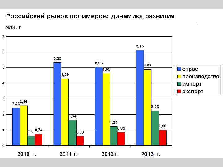 Волжский кластер – проекты: ОАО «Новокуйбышевская нефтехимическая компания» • Этилен ― 1500 тыс. т/г • Метилметакрилат ― 70 тыс. т/г • Полиметилметакрилат ― 50 тыс. т/г • Полипропилен - 790 тыс. т/г • Поливинилхлорид – 500 тыс. т/г • ПЭ низкого давления ― 450 тыс. т/г • Линейный ПЭНП ― 415 тыс. т/г После поглощения САНОРСа Роснефтью новостей о планируемом строительстве нет. ООО «Рус. Винил» - строительство нового производства поливинилхлорида (ПВХ) мощностью 330 тыс. т в год ( «Сибур» / Solvay, год запуска - 2018 год); «Сибур – Кстово» - реконструкция ЭП-300 с расширением до 450 тыс. т в год; -расширение производства оксида этилена на 35 тыс. т; - строительство нового производства полипропилена мощностью 200 тыс. т в год Год запуска 2015 -2018. ОАО «Казаньоргсинтез» - расширение пиролизных мощностей на на 400 тыс. т по этилену и строительство нового производства полиэтилена мощностью 150 тыс. т в год (год запуска 2020)