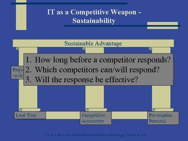 IT as a Competitive Weapon Sustainability Sustainable Advantage 1. How long before a competitor responds? Supply Project 2. Which competitors can/will respond? Life. Competitor System cycle Analysis 3. Will the response be effective? Lead Time Competitive Asymmetry “IT as a Basis for Sustainable Competitive Advantage, ” Feeny & Ives Pre-emption Potential