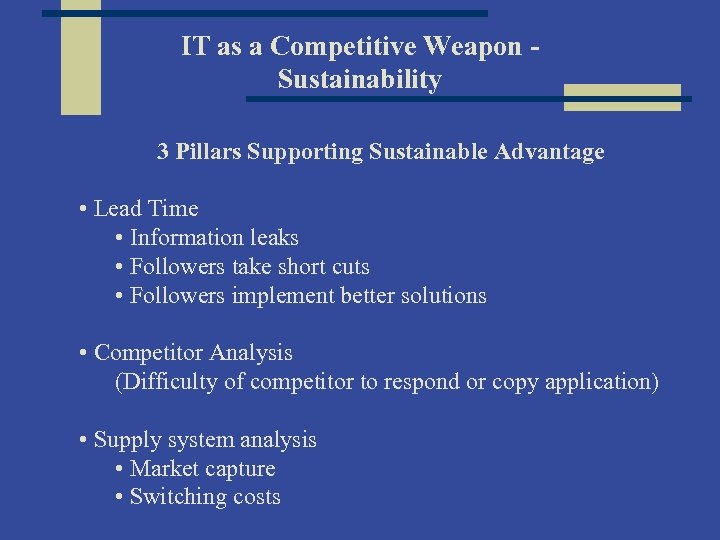 IT as a Competitive Weapon Sustainability 3 Pillars Supporting Sustainable Advantage • Lead Time • Information leaks • Followers take short cuts • Followers implement better solutions • Competitor Analysis (Difficulty of competitor to respond or copy application) • Supply system analysis • Market capture • Switching costs