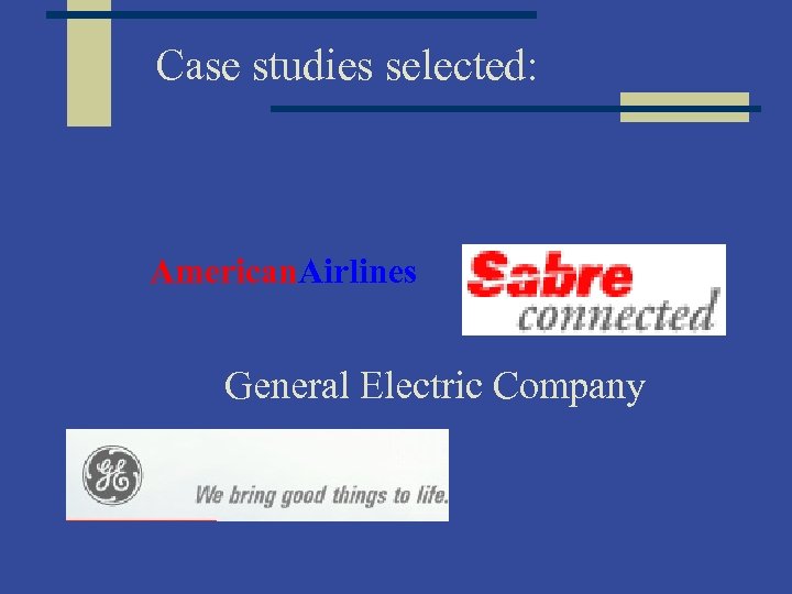Case studies selected: American. Airlines General Electric Company