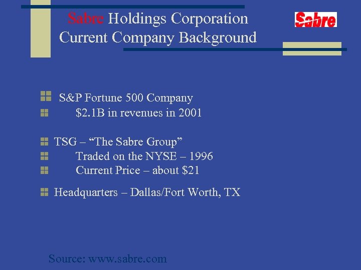 Sabre Holdings Corporation Current Company Background S&P Fortune 500 Company $2. 1 B in revenues in 2001 TSG – “The Sabre Group” Traded on the NYSE – 1996 Current Price – about $21 Headquarters – Dallas/Fort Worth, TX Source: www. sabre. com