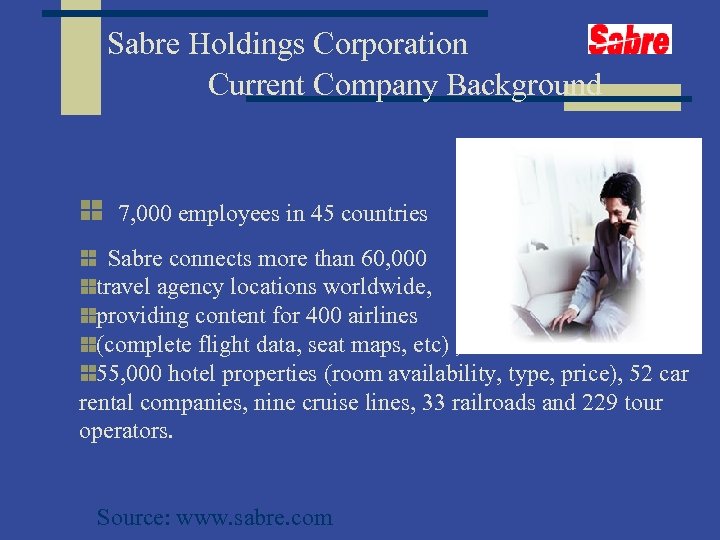 Sabre Holdings Corporation Current Company Background 7, 000 employees in 45 countries Sabre connects more than 60, 000 travel agency locations worldwide, providing content for 400 airlines (complete flight data, seat maps, etc) , 55, 000 hotel properties (room availability, type, price), 52 car rental companies, nine cruise lines, 33 railroads and 229 tour operators. Source: www. sabre. com