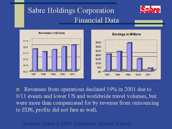 Sabre Holdings Corporation Financial Data Revenues from operations declined 19% in 2001 due to 9/11 events and lower US and worldwide travel volumes, but were more than compensated for by revenue from outsourcing to EDS, profits did not fare as well. Source: Sabre’s 2001 Summary Annual Report