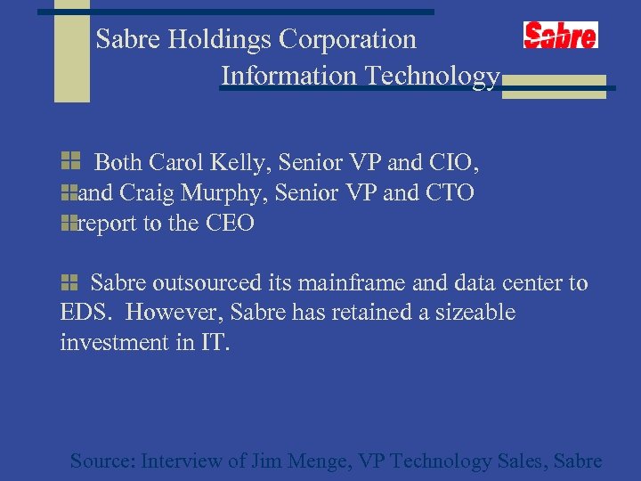 Sabre Holdings Corporation Information Technology Both Carol Kelly, Senior VP and CIO, and Craig Murphy, Senior VP and CTO report to the CEO Sabre outsourced its mainframe and data center to EDS. However, Sabre has retained a sizeable investment in IT. Source: Interview of Jim Menge, VP Technology Sales, Sabre