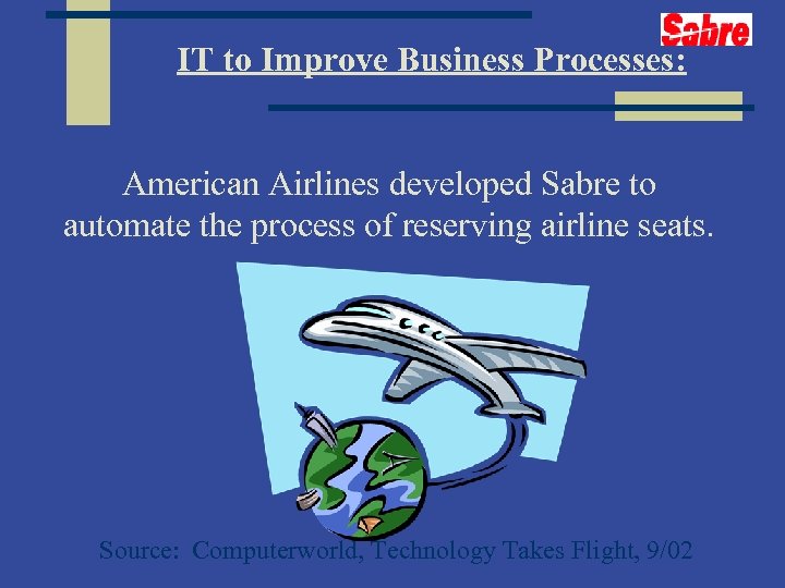 IT to Improve Business Processes: American Airlines developed Sabre to automate the process of reserving airline seats. Source: Computerworld, Technology Takes Flight, 9/02