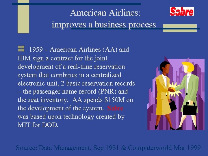 American Airlines: improves a business process 1959 – American Airlines (AA) and IBM sign a contract for the joint development of a real-time reservation system that combines in a centralized electronic unit, 2 basic reservation records – the passenger name record (PNR) and the seat inventory. AA spends $150 M on the development of the system. Sabre was based upon technology created by MIT for DOD. Source: Data Management, Sep 1981 & Computerworld Mar 1999