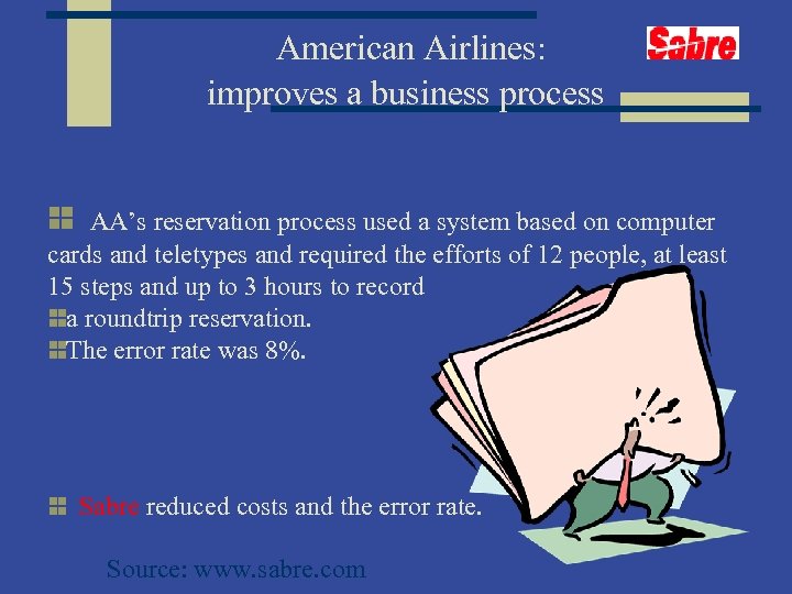 American Airlines: improves a business process AA’s reservation process used a system based on computer cards and teletypes and required the efforts of 12 people, at least 15 steps and up to 3 hours to record a roundtrip reservation. The error rate was 8%. Sabre reduced costs and the error rate. Source: www. sabre. com