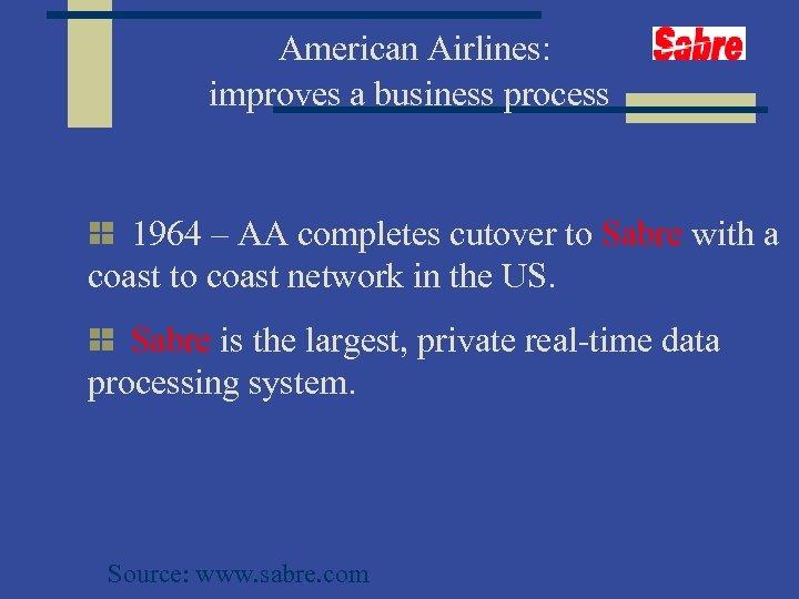 American Airlines: improves a business process 1964 – AA completes cutover to Sabre with a coast to coast network in the US. Sabre is the largest, private real-time data processing system. Source: www. sabre. com
