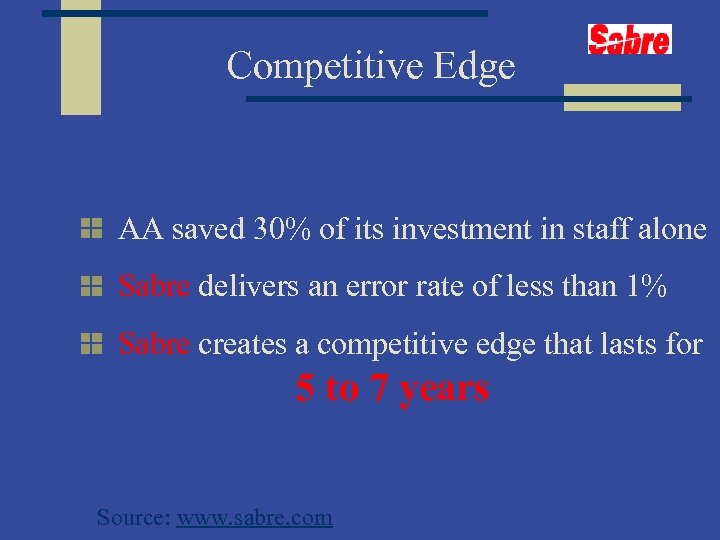 Competitive Edge AA saved 30% of its investment in staff alone Sabre delivers an error rate of less than 1% Sabre creates a competitive edge that lasts for 5 to 7 years Source: www. sabre. com