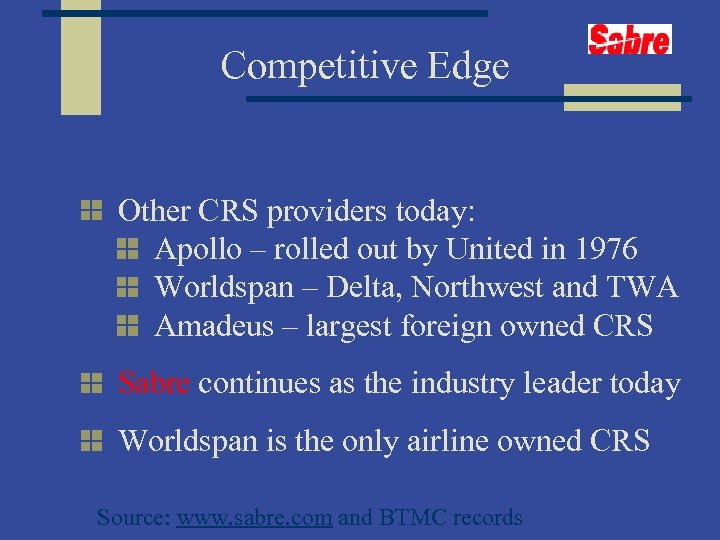 Competitive Edge Other CRS providers today: Apollo – rolled out by United in 1976 Worldspan – Delta, Northwest and TWA Amadeus – largest foreign owned CRS Sabre continues as the industry leader today Worldspan is the only airline owned CRS Source: www. sabre. com and BTMC records