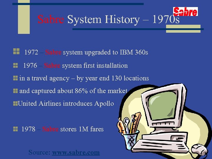 Sabre System History – 1970 s 1972 – Sabre system upgraded to IBM 360 s 1976 – Sabre system first installation in a travel agency – by year end 130 locations and captured about 86% of the market United Airlines introduces Apollo 1978 – Sabre stores 1 M fares Source: www. sabre. com