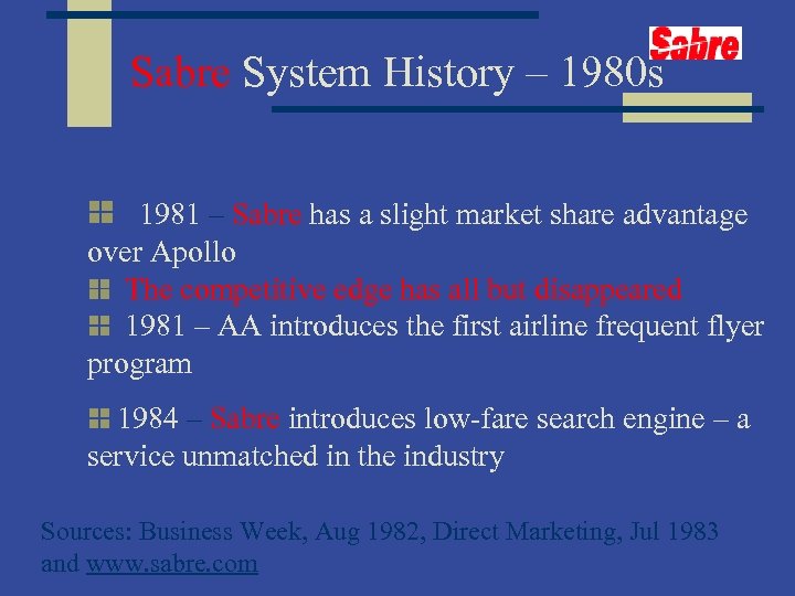 Sabre System History – 1980 s 1981 – Sabre has a slight market share advantage over Apollo The competitive edge has all but disappeared 1981 – AA introduces the first airline frequent flyer program 1984 – Sabre introduces low-fare search engine – a service unmatched in the industry Sources: Business Week, Aug 1982, Direct Marketing, Jul 1983 and www. sabre. com