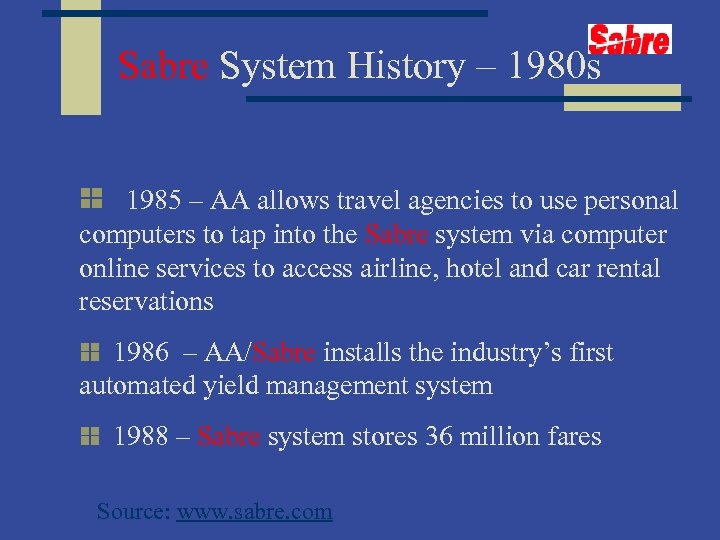 Sabre System History – 1980 s 1985 – AA allows travel agencies to use personal computers to tap into the Sabre system via computer online services to access airline, hotel and car rental reservations 1986 – AA/Sabre installs the industry’s first automated yield management system 1988 – Sabre system stores 36 million fares Source: www. sabre. com