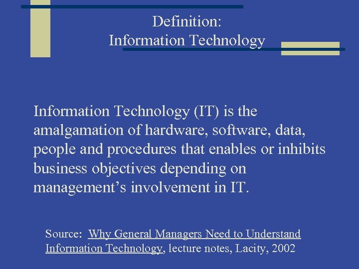 Definition: Information Technology (IT) is the amalgamation of hardware, software, data, people and procedures that enables or inhibits business objectives depending on management’s involvement in IT. Source: Why General Managers Need to Understand Information Technology, lecture notes, Lacity, 2002
