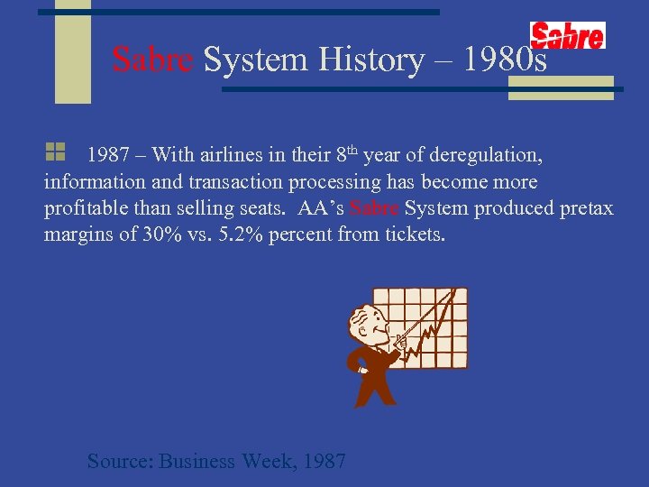 Sabre System History – 1980 s 1987 – With airlines in their 8 th year of deregulation, information and transaction processing has become more profitable than selling seats. AA’s Sabre System produced pretax margins of 30% vs. 5. 2% percent from tickets. Source: Business Week, 1987
