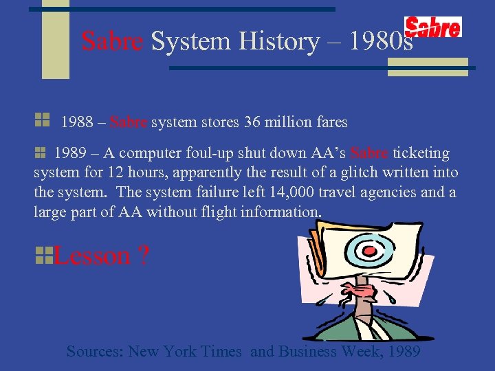 Sabre System History – 1980 s 1988 – Sabre system stores 36 million fares 1989 – A computer foul-up shut down AA’s Sabre ticketing system for 12 hours, apparently the result of a glitch written into the system. The system failure left 14, 000 travel agencies and a large part of AA without flight information. Lesson ? Sources: New York Times and Business Week, 1989