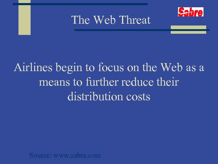 The Web Threat Airlines begin to focus on the Web as a means to further reduce their distribution costs Source: www. sabre. com