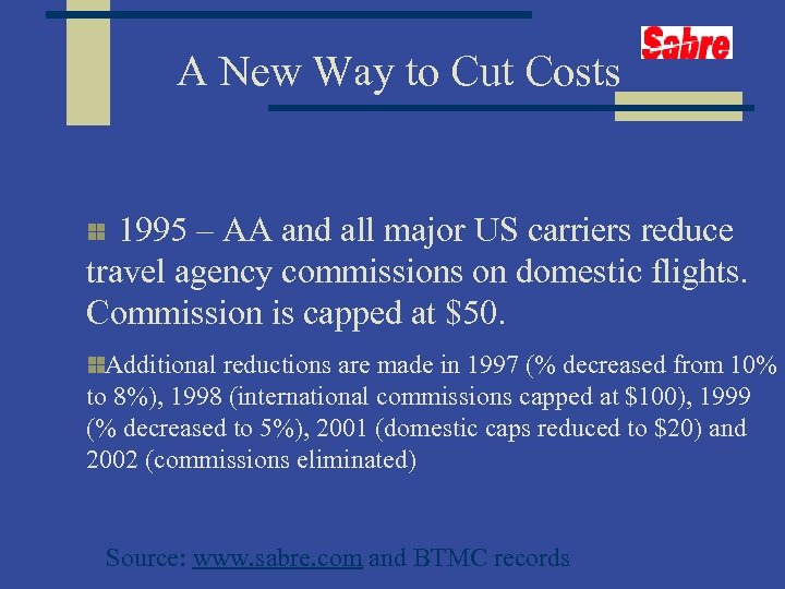 A New Way to Cut Costs 1995 – AA and all major US carriers reduce travel agency commissions on domestic flights. Commission is capped at $50. Additional reductions are made in 1997 (% decreased from 10% to 8%), 1998 (international commissions capped at $100), 1999 (% decreased to 5%), 2001 (domestic caps reduced to $20) and 2002 (commissions eliminated) Source: www. sabre. com and BTMC records