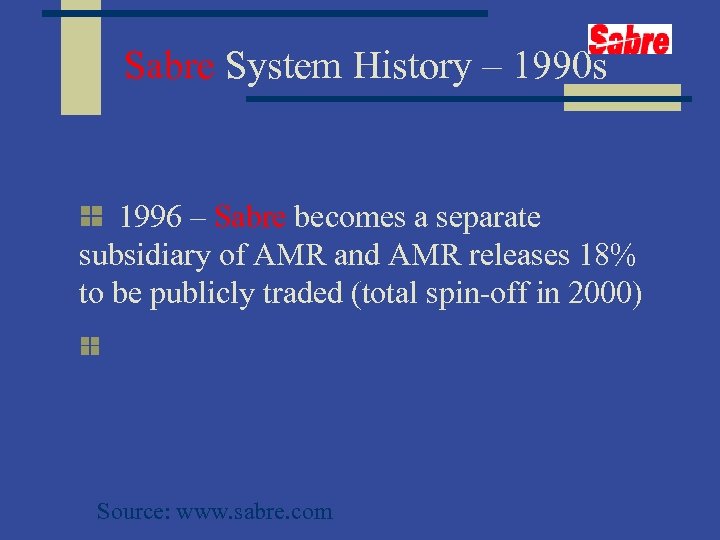 Sabre System History – 1990 s 1996 – Sabre becomes a separate subsidiary of AMR and AMR releases 18% to be publicly traded (total spin-off in 2000) Source: www. sabre. com
