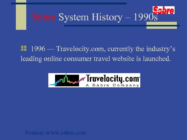 Sabre System History – 1990 s 1996 –– Travelocity. com, currently the industry’s leading online consumer travel website is launched. Source: www. sabre. com