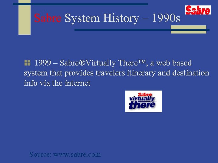 Sabre System History – 1990 s 1999 – Sabre®Virtually There™, a web based system that provides travelers itinerary and destination info via the internet Source: www. sabre. com