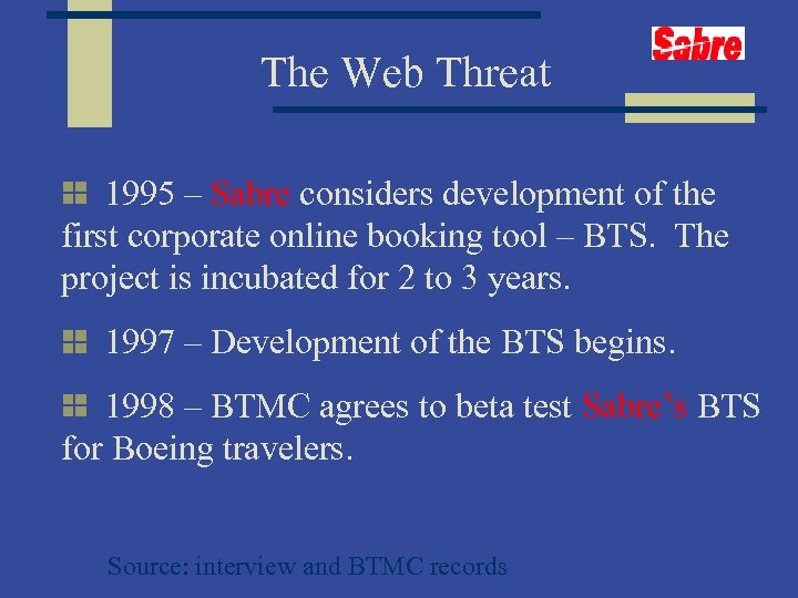 The Web Threat 1995 – Sabre considers development of the first corporate online booking tool – BTS. The project is incubated for 2 to 3 years. 1997 – Development of the BTS begins. 1998 – BTMC agrees to beta test Sabre’s BTS for Boeing travelers. Source: interview and BTMC records