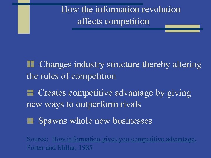 How the information revolution affects competition Changes industry structure thereby altering the rules of competition Creates competitive advantage by giving new ways to outperform rivals Spawns whole new businesses Source: How information gives you competitive advantage, Porter and Millar, 1985