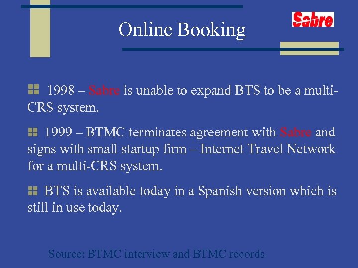 Online Booking 1998 – Sabre is unable to expand BTS to be a multi. CRS system. 1999 – BTMC terminates agreement with Sabre and signs with small startup firm – Internet Travel Network for a multi-CRS system. BTS is available today in a Spanish version which is still in use today. Source: BTMC interview and BTMC records